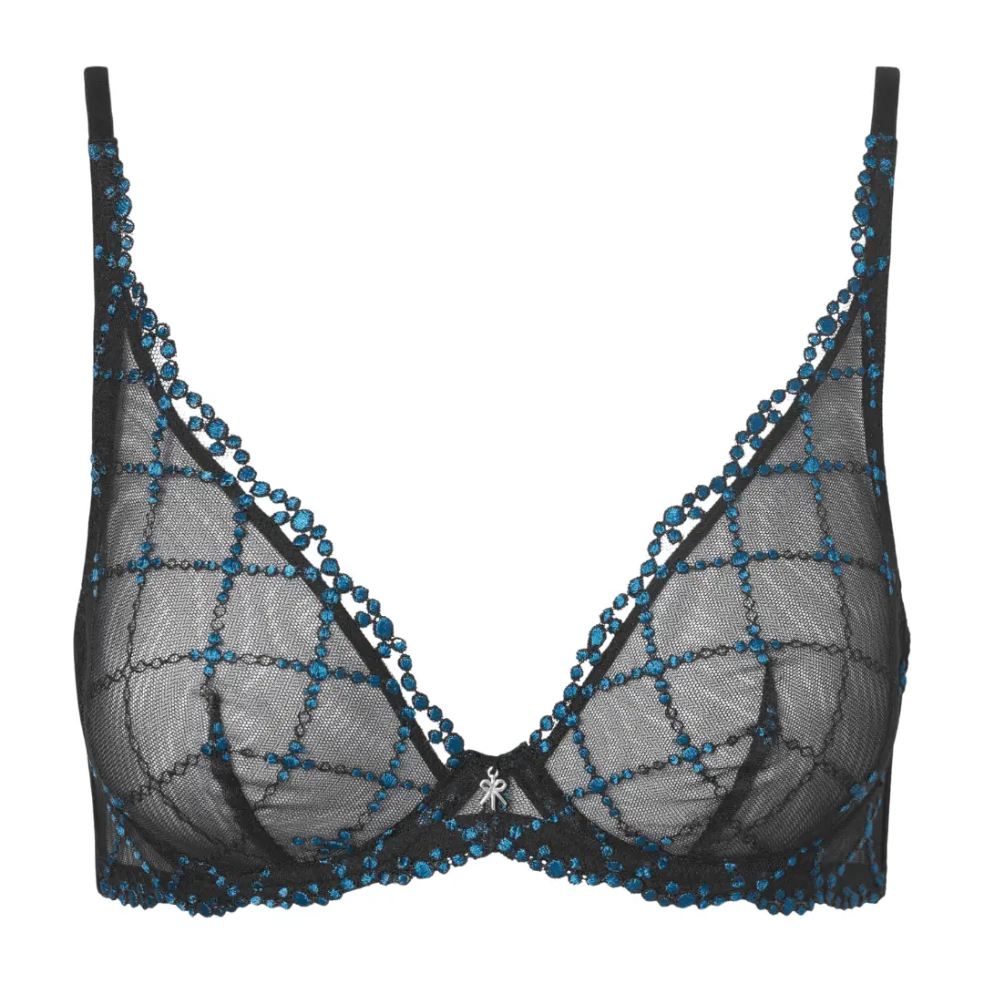 Black and blue gem bra: Sheer black underwire bra with a grid pattern formed by blue beaded embellishments and a small bow at the center front.