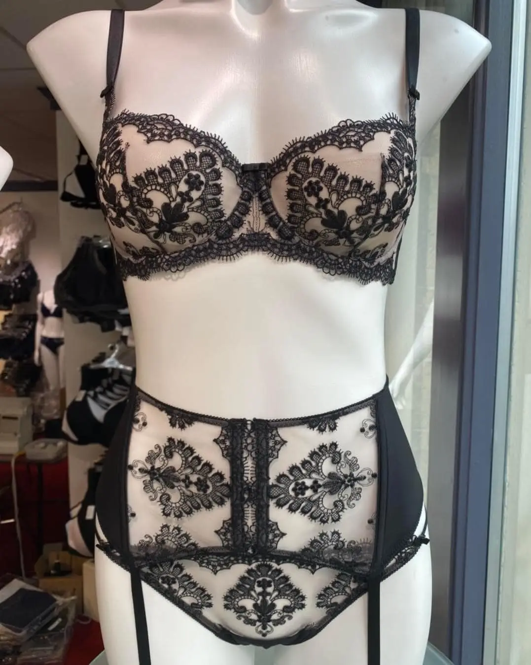 A black lace lingerie set displayed on a mannequin, featuring an underwire bra with detailed black floral lace and a matching high-waisted garter belt with intricate lace patterns. The garter belt includes straps for attaching stockings, creating a vintage-inspired, elegant look.