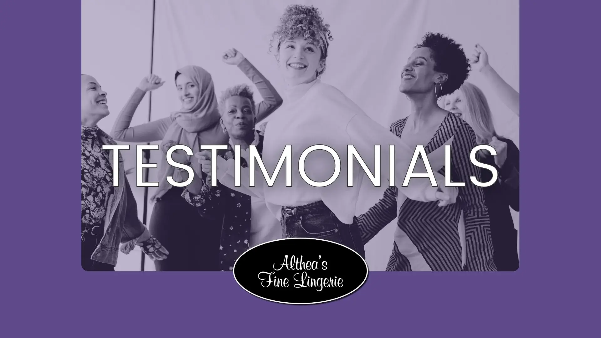 A promotional graphic for "Testimonials" at Althea's Fine Lingerie. The image shows a group of diverse, joyful women standing together with raised arms in celebration. The word "TESTIMONIALS" is prominently displayed in large white letters across the center, with the store's logo featuring cursive text below, set against a purple background.