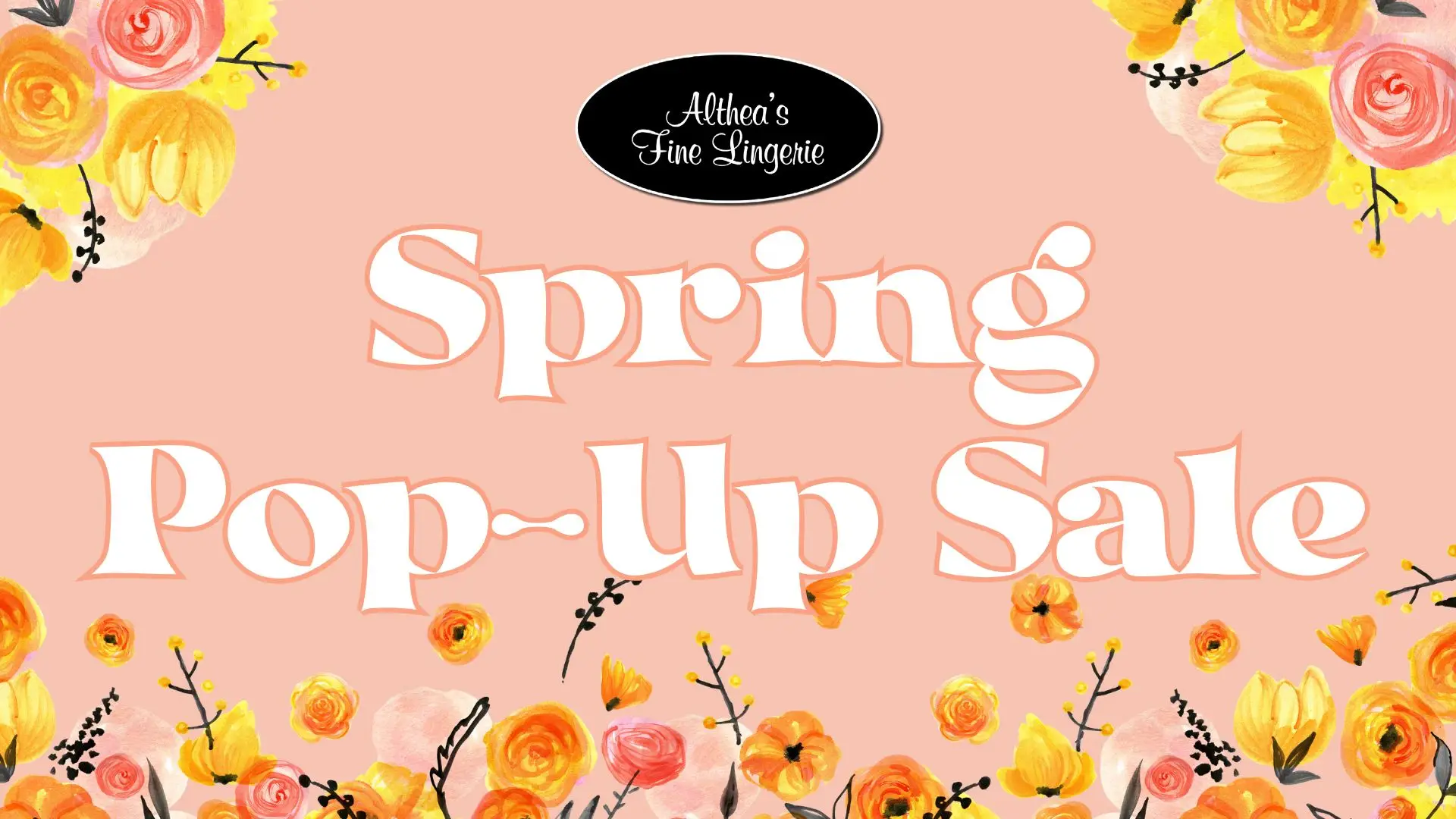 Promotional graphic for "Althea's Fine Lingerie Spring Pop-Up Sale." The background is a soft peach color with elegant white text outlined in a darker shade. Surrounding the text are watercolor-style floral illustrations featuring yellow, orange, and pink flowers with black stems and small accents. At the top, a black oval logo with white cursive text reads "Althea’s Fine Lingerie.