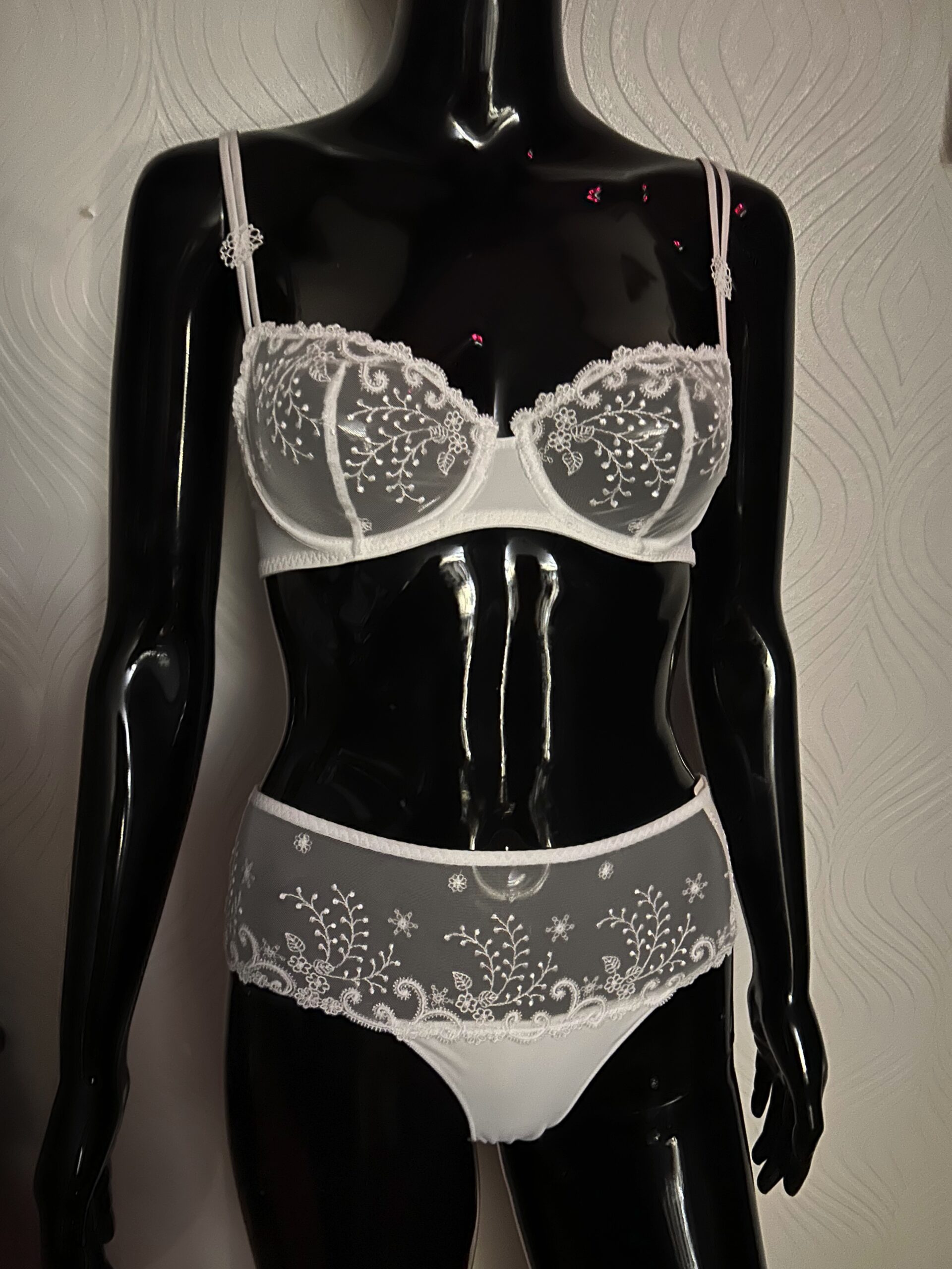 A glossy black mannequin wearing a white lace lingerie set. The bra features intricate sheer lace with floral embroidery and a small satin bow in the center. The matching panties have a combination of lace and opaque fabric with delicate embroidery along the waistband and sides. The mannequin is positioned against a textured white wall background.