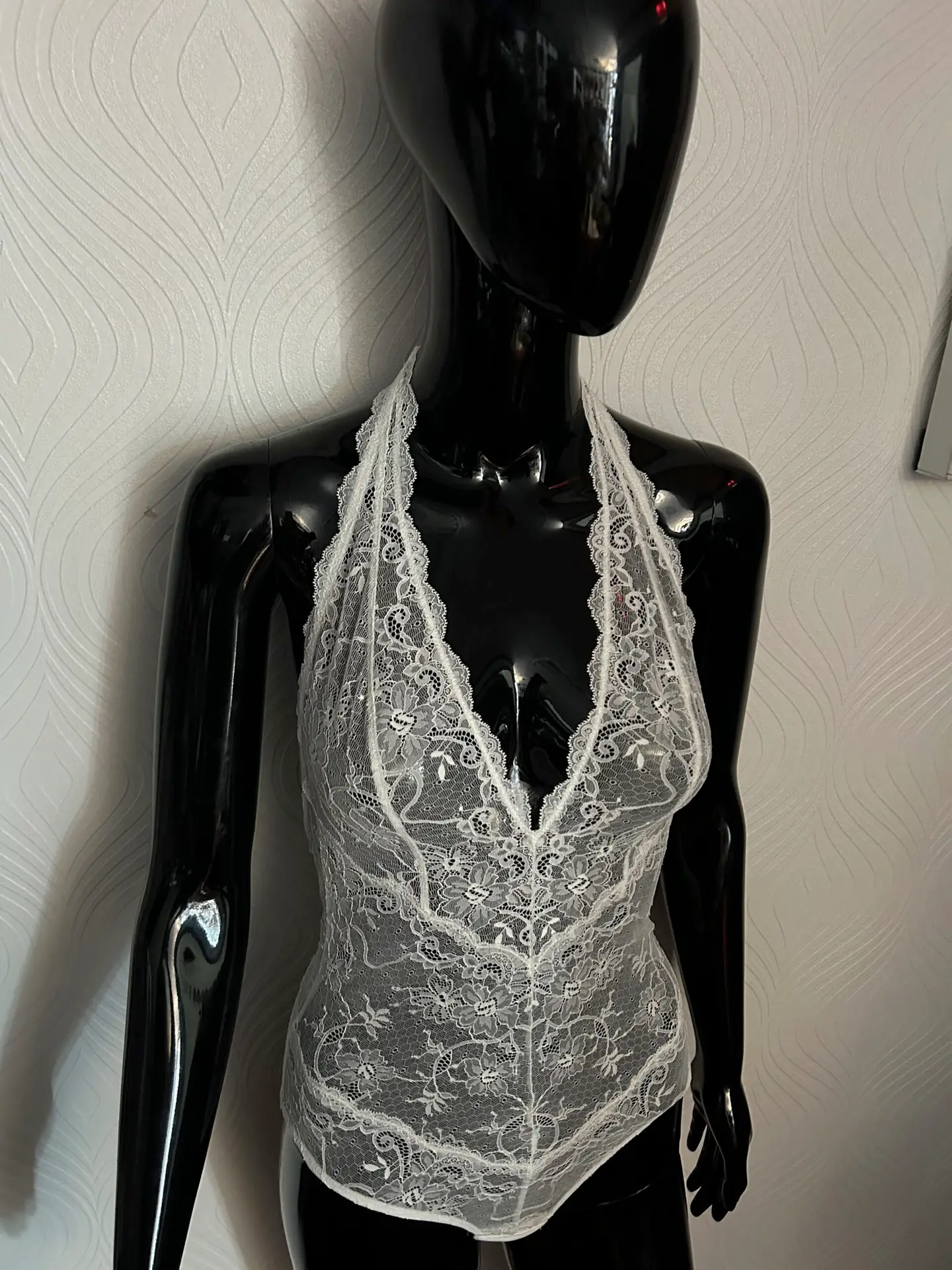 A glossy black mannequin wearing a white lace bodysuit with a halter neckline. The sheer lace fabric features an intricate floral pattern, with scalloped lace trim along the neckline and edges. The mannequin is posed against a textured white wall background.