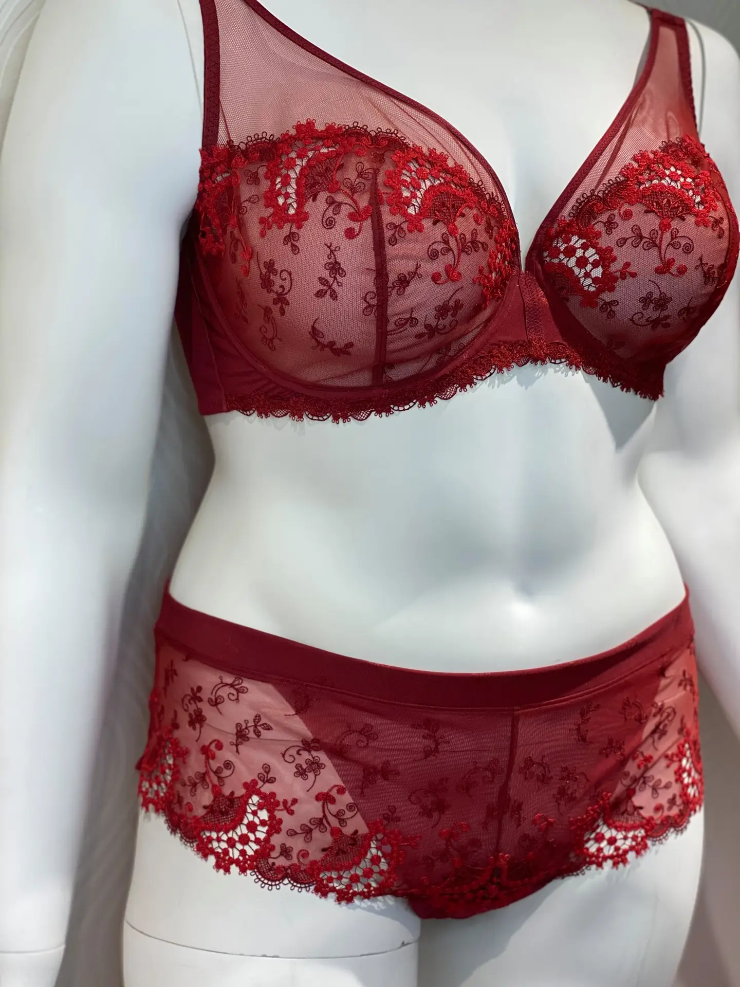 A sheer red lingerie set displayed on a mannequin, featuring a bra and matching panties with intricate red and white floral embroidery. The bra has supportive underwire cups with delicate lace trim, while the high-waisted panties are adorned with matching floral lace at the edges, creating an elegant, coordinated look.